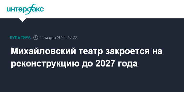 Москва. 11 марта. INTERFAX.RU - Михайловский театр будет закрыт на реконструкцию, которая, как ожидается, продлится, до 2027 года, театр откроется в начале нового театрального сезона, сообщил губернатор Санкт-Петербурга Александр Беглов.