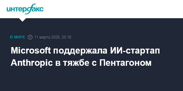 Москва. 11 марта. INTERFAX.RU - Microsoft Corp. поддержала ИИ-стартап Anthropic в судебном разбирательстве с Пентагоном, в рамках которого он оспаривает решение военного ведомства включить его в список ненадежных поставщиков, сообщает Financial Times.