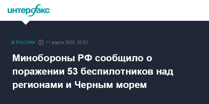 Москва. 11 марта. INTERFAX.RU - Российские военные сообщили, что с 14:00 до 20:00 дежурными средствами ПВО перехвачены и уничтожены 53 украинских беспилотных летательных аппаратов самолетного типа.
