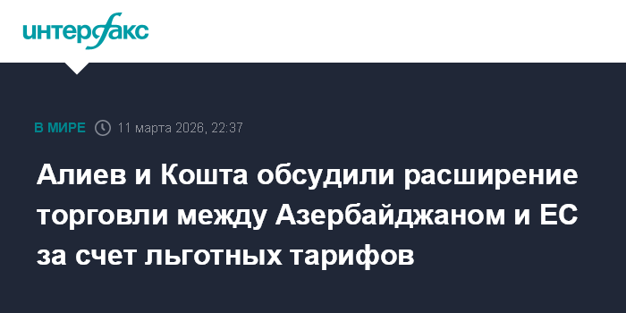 Москва. 11 марта. INTERFAX.RU - Президент Азербайджана Ильхам Алиев и президент Совета Евросоюза Антониу Кошта в ходе встречи в расширенном составе в Баку обсудили перспективы расширения торговых связей между Баку и Брюсселем на основе принципов льготных тарифов.