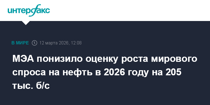 Москва. 12 марта. INTERFAX.RU - Спрос на нефть в мире в 2026 году относительно предыдущего года вырастет на 644 тыс. б/с, сообщается в ежемесячном отчете Международного энергетического агентства (МЭА).