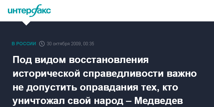 "Мы много внимания уделяем борьбе с фальсификацией нашей истории. И почему-то зачастую считаем, что речь идёт только о недопустимости пересмотра результатов Великой Отечественной войны. Но не менее важно не допустить под видом восстановления исторической справедливости оправдания тех, кто уничтожал свой народ", - заявил Д.Медведев в пятницу в своем видеоблоге.