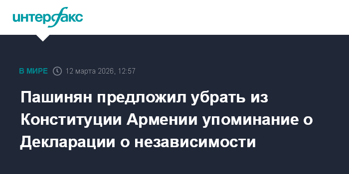 Москва. 12 марта. INTERFAX.RU - В новой Конституции Армении не должно быть ссылки на Декларацию о независимости, заявил премьер-министр республики Никол Пашинян на брифинге после заседания правительства.