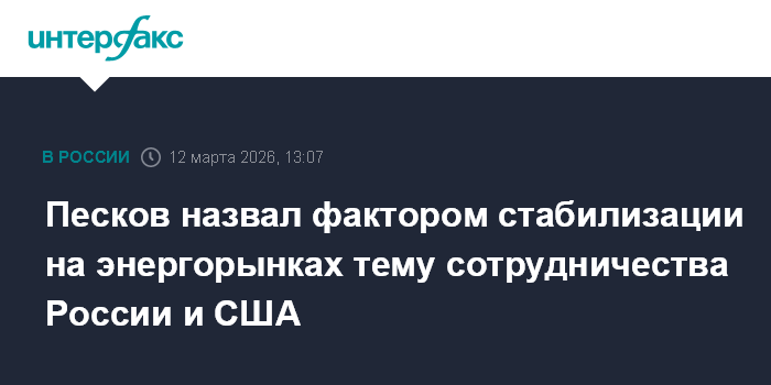 Москва. 12 марта. INTERFAX.RU - В Кремле заявили, что тема взаимодействия России и США на энергетических рынках является фактором стабилизации на этих рынках, она обсуждается в ходе диалога двух стран, но пока рано говорить об эффективном взаимодействии в этой сфере.