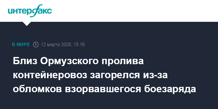 Москва. 12 марта. INTERFAX.RU - На контейнеровозе Source Blessing , который шел под Либерийским флагом вблизи Ормузского пролива, случился пожар из-за попадания обломков разорвавшего боезаряда, сообщила германская судоходная компания-владелец Hapag-Lloyd.