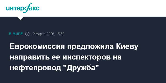 Москва. 12 марта. INTERFAX.RU - Еврокомиссия (ЕК) предложила Украине организовать миссию для инспекции нефтепровода "Дружба" в связи с остановкой его функционирования, сообщила журналистам официальный представитель ЕК Анна-Кайса Итконен.