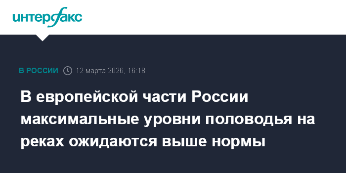 Москва. 12 марта. INTERFAX.RU - Максимальные уровни весеннего половодья на большинстве рек европейской части России в 2026 году ожидаются выше нормы, существенно выше нормы уровень воды ожидается на реках бассейна Волги, в нижнем течении Оки, в верховьях Дона, а также на ряде рек Сибири и Дальнего Востока, на участках рек Забайкалья.