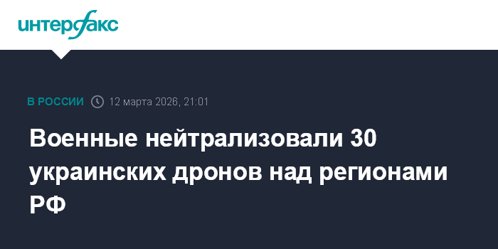 Москва. 12 марта. INTERFAX.RU - Средства противовоздушной обороны с 14:00 до 20:00 перехватили и уничтожили 30 украинских беспилотников над российскими регионами, сообщило министерство обороны РФ в четверг.