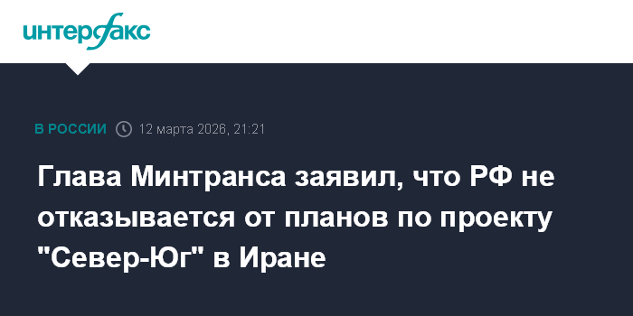 Москва. 12 марта. INTERFAX.RU - Россия не отказывается от планов по реализации проекта Международного транспортного коридора (МТК) "Север-Юг" в Иране, рассчитывает продолжить работы после окончания конфликта на Ближнем Востоке, сообщил глава Минтранса Андрей Никитин.