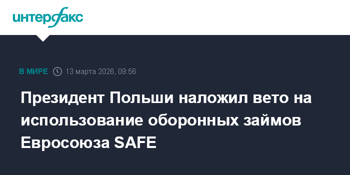 Москва. 13 марта. INTERFAX.RU - Президент Польши Кароль Навроцкий объявил о решении наложить вето на законопроект о реализации программы оборонных займов Евросоюза SAFE.