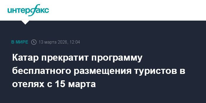 "По информации Управления по туризму Катара (Qatar Tourism), местными властями принято решение о прекращении действия программы "безвозмездного проживания туристов", находящихся в отелях страны. Последняя ночь действия программы - с 14 на 15 марта. С 12:00 15.03.2026 г. туристы должны выехать из отеля, либо продлить проживание за свой счет. Катарская сторона настоятельно рекомендует туристам рассмотреть возможность покинуть страну в ближайшее возможное время", - говорится в сообщении дипмиссии в соцсетях.