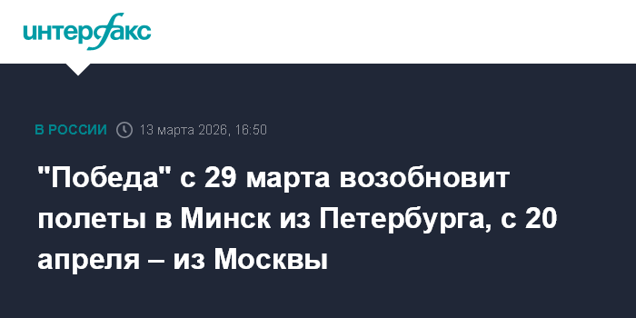 Москва. 13 марта. INTERFAX.RU - Авиакомпания "Победа" с 29 марта планирует возобновить регулярные рейсы в Минск из Санкт-Петербурга, сообщила компания.