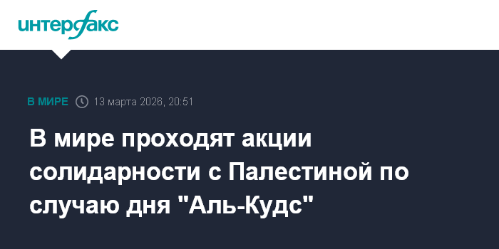 Москва. 13 марта. INTERFAX.RU - Люди по всему миру вышли на улицы по случаю международного дня "Аль-Кудс" - дня солидарности с Палестиной, сообщает "Аль-Джазира".