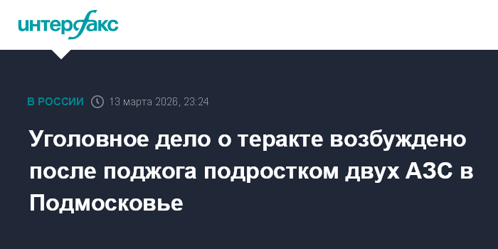 Москва. 13 марта. INTERFAX.RU - Полицейские возбудили два уголовных дела после поджога 15-летним подростком двух АЗС в Истре под влиянием мошенников, сообщила начальник Управления информации и общественных связей ГУ МВД России по Московской области Татьяна Петрова.