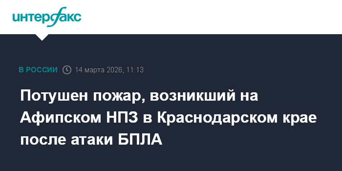 Москва. 14 марта. INTERFAX.RU - - Пожар на территории Афипского НПЗ в Северском районе Краснодарского края, возникший из-за падения обломков беспилотников, ликвидирован, сообщил в субботу глава Северского района Алексей Чеверев.