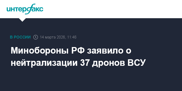 Москва. 14 марта. INTERFAX.RU - Российские военнослужащие в период с 08:00 по 11:00 по московскому времени перехватили и уничтожили 37 украинских беспилотников, заявили в Минобороны России в субботу.