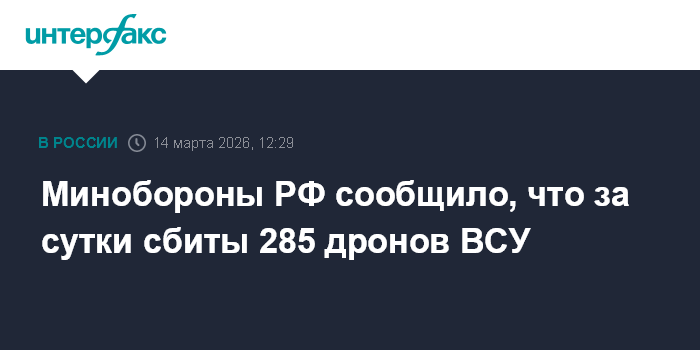 Москва. 14 марта. INTERFAX.RU - Средства ПВО за сутки уничтожили 285 беспилотников ВСУ, сообщили в Минобороны РФ в субботу.