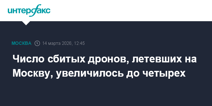 Москва. 14 марта. INTERFAX.RU - Мэр Москвы Сергей Собянин сообщил о еще двух сбитых беспилотниках, летевших в направлении Москвы, общее количество уничтоженных за субботу БПЛА выросло до четырех.
