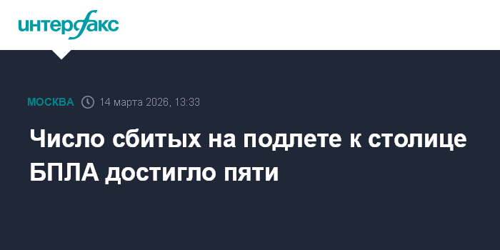 Москва. 14 марта. INTERFAX.RU - Сбит пятый БПЛА, летевший на столицу, сообщил в субботу мэр Москвы Сергей Собянин.