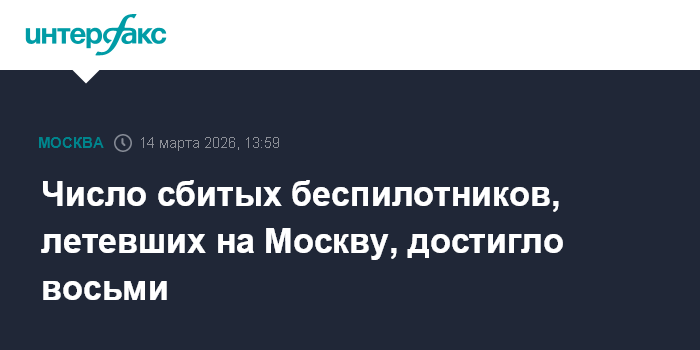 Москва. 14 марта. INTERFAX.RU - Мэр Москвы Сергей Собянин сообщил о еще трех сбитых БПЛА, летевших в направлении столицы, общее количество уничтоженных за субботу БПЛА выросло до восьми.