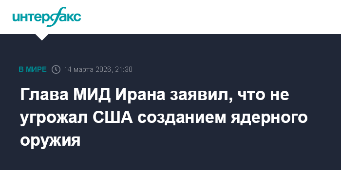 Москва. 14 марта. INTERFAX.RU - Министр иностранных дел Ирана Аббас Аракчи назвал ложными сообщения о том, что он угрожал созданием атомных бомб американским переговорщикам Стиву Уиткоффу и Джареду Кушнеру.
