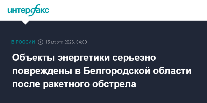 Москва. 15 марта. INTERFAX.RU - Губернатор Белгородской области Вячеслав Гладков заявил, что Белгород и Белгородский округ подверглись массированному ракетному обстрелу со стороны Украины, серьезно повреждены объекты энергетической инфраструктуры.