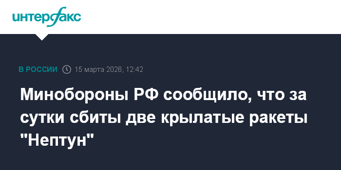 Москва. 15 марта. INTERFAX.RU - Российские военнослужащие в течение суток сбили две управляемые ракеты большой дальности "Нептун", заявили в Минобороны России в воскресенье.