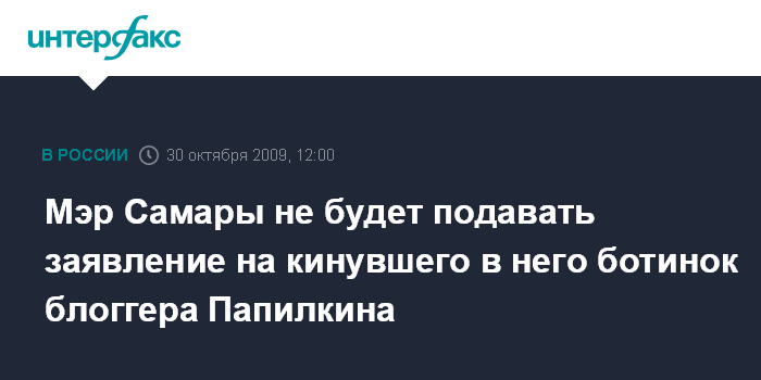 Затем он в шутку добавил, что в "следующий раз для обороны мы положим свой ботинок на стол". Как сообщалось, в мэра Самары в ходе пресс-конференции в самарском бюро агентства "Интерфакс-Поволжье" блоггер Папилкин бросил ботинком, В.Тархов отбил брошенный туфель. Блоггер был выдворен охраной.