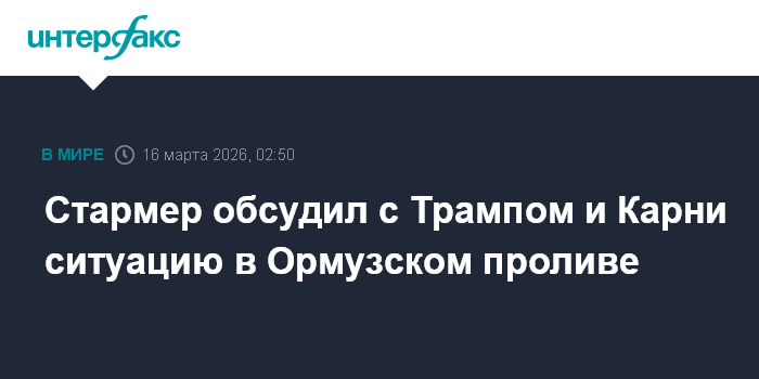Согласно сообщению о беседе Стармера и Карни, британский и канадский премьеры обсудили Ближний Восток и влияние "продолжающегося перекрытия Ормузского пролива на международное судоходство", договорившись продолжить обсуждение конфликта в регионе в ходе их предстоящей встречи.