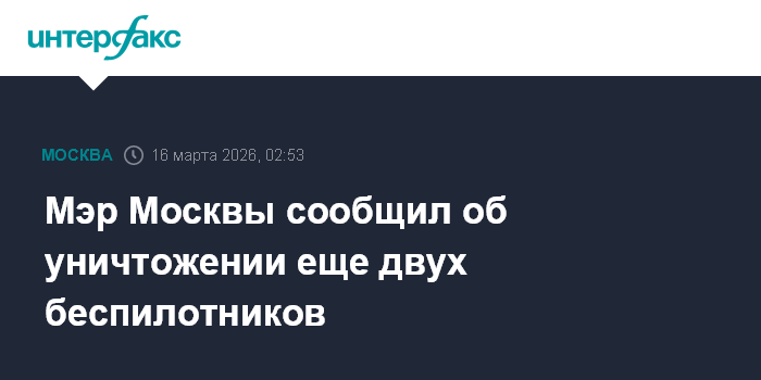 Москва. 16 марта. INTERFAX.RU - Уничтожены еще два беспилотника, пытавшихся атаковать Москву, сообщил мэр столицы Сергей Собянин.