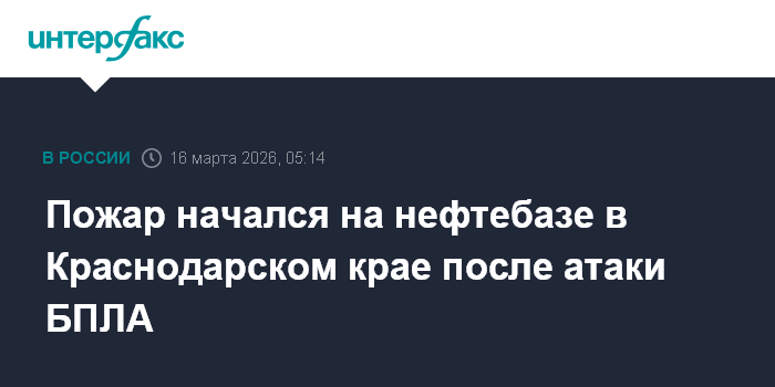 Москва. 16 марта. INTERFAX.RU - Территория нефтебазы загорелась в промзоне Лабинска в Краснодарском крае в результате атаки БПЛА, сообщает оперштаб региона.