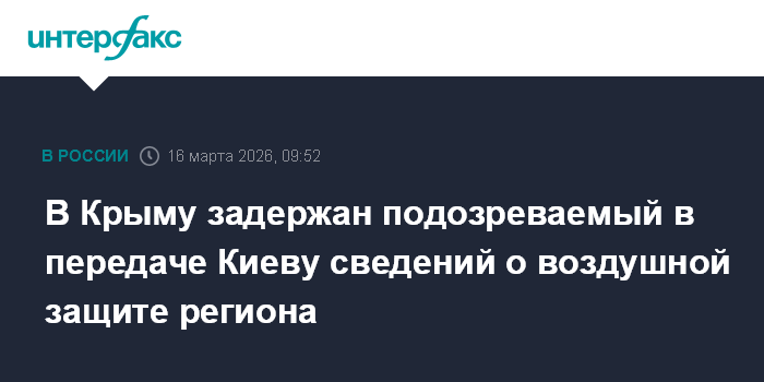 Москва. 16 марта. INTERFAX.RU - ФСБ сообщила о задержании и аресте в Крыму местного жителя, который передал украинским спецслужбам сведения о военной технике, используемой для защиты полуострова.