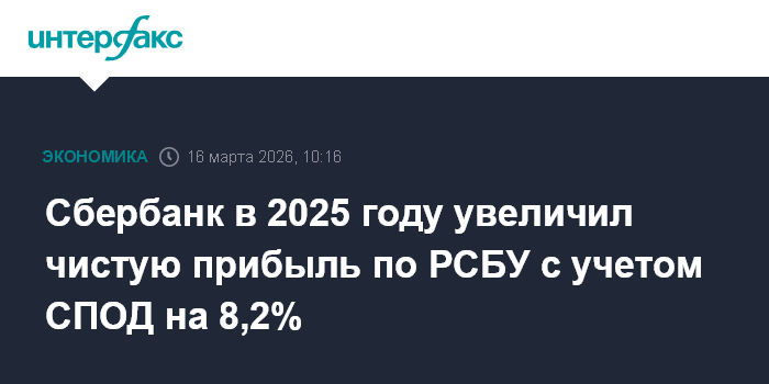 Москва. 16 марта. INTERFAX.RU - Сбербанк в 2025 году увеличил чистую прибыль по РСБУ с учетом событий после отчетной даты (СПОД) на 8,2% - до 1 трлн 682,7 млрд рублей, следует из годовой бухгалтерской отчетности банка.