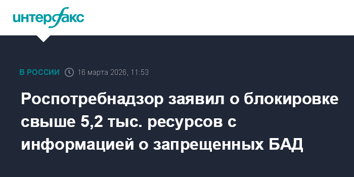 Москва. 16 марта. INTERFAX.RU - В России заблокировано более 5 тыс. интернет-ресурсов, распространяющих информацию о розничной продаже биологически активных добавок (БАД), реализация которых в РФ запрещена, сообщили в Роспотребнадзоре.