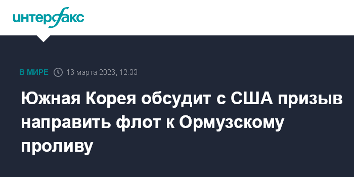 Москва. 16 марта. INTERFAX.RU - В администрации президента Южной Кореи заявили в понедельник, что обращение президента США Дональда Трампа о направлении южнокорейских кораблей в зону Ормузского пролива требует тщательного обсуждения между Сеулом и Вашингтоном.