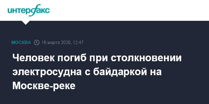 Москва. 16 марта. INTERFAX.RU - В результате столкновения электросудна с байдаркой на Москве-реке погиб один человек, возбуждено дело о нарушении правил безопасности движения водного транспорта. Об этом сообщили в Западном межрегиональном управлении на транспорте (ЗМСУТ) Следственного комитета РФ.