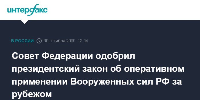 Москва. 30 октября. INTERFAX.RU - Совет Федерации на заседании в пятницу одобрил законопроект об оперативном использовании Вооруженных сил РФ за пределами страны. Документ внесен президентом РФ. Сенаторы внесли поправки в действующий закон "Об обороне". Законопроектом перечисляются задачи, при выполнении которых могут использоваться Вооруженные силы России за ее пределами.
