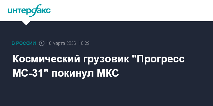 Москва. 16 марта. INTERFAX.RU - Транспортный грузовой корабль "Прогресс МС-31" отстыковался от Международной космической станции (МКС) для последующего затопления в Тихом океане, следует из трансляции "Роскосмоса" в понедельник.