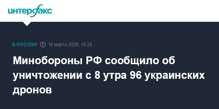 Москва. 16 марта. INTERFAX.RU - Российские средства ПВО с 8:00 до 16:00 понедельника перехватили и уничтожили 96 украинских беспилотных летательных аппаратов самолётного типа, сообщает Минобороны России.