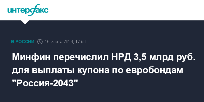Москва. 16 марта. INTERFAX.RU - Минфин перечислил НРД 3,5 млрд руб. для выплаты купона по евробондам "Россия-2043" и замещающему выпуску