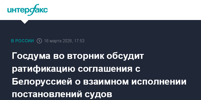 "На пленарном заседании 17 марта обсудим ратификацию Соглашения между Россией и Беларусью о порядке взаимного исполнения судебных постановлений", - цитирует пресс-служба Госдумы слова Володина по итогам Совета Думы.