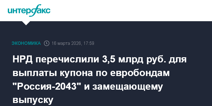 Москва. 16 марта. INTERFAX.RU - Минфин РФ перечислил в Национальный расчетный депозитарий (НРД) 3,5 млрд рублей (эквивалент $44,1 млн) для выплаты купонного дохода по суверенным еврооблигациям со сроком погашения в 2043 году, а также по замещающему эти евробонды выпуску, следует из сообщения министерства.