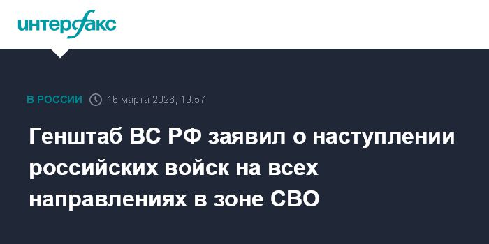 Москва. 16 марта. INTERFAX.RU - Начальник Генштаба ВС РФ Валерий Герасимов заявил, что российские войска продолжают наступление на всех направлениях в зоне СВО.