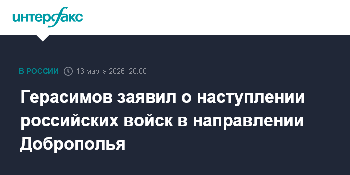 Москва. 16 марта. INTERFAX.RU - Российские силы наступают в направлении города Доброполье, сообщил начальник Генштаба РФ Валерий Герасимов.