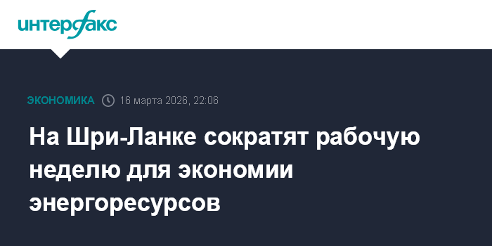 Москва. 16 марта. INTERFAX.RU - Власти Шри-Ланки объявили, что временно вводят четырехдневную рабочую неделю для экономии энергоресурсов на фоне ситуации на Ближнем Востоке, сообщают местные СМИ.