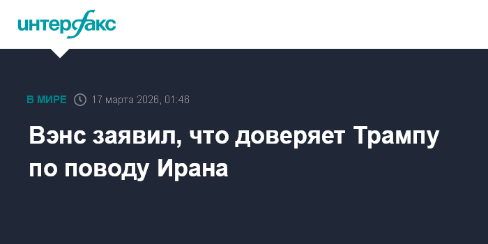 Москва. 17 марта. INTERFAX.RU - Вице-президент США Джей Ди Вэнс заверил, что не сомневается в способности президента страны Дональда Трампа найти оптимальное решение конфликта с Ираном.