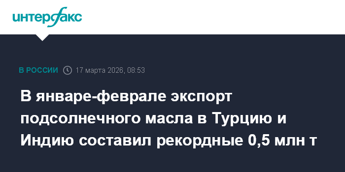 Москва. 17 марта. INTERFAX.RU - Россия в январе-феврале 2026 года экспортировала в Турцию и Индию 0,5 млн тонн подсолнечного масла, что стало рекордным показателем для этого периода и на 18% превысило поставки за январь-февраль 2024 года, сообщили "Интерфаксу" в федеральном центре "Агроэкспорт".