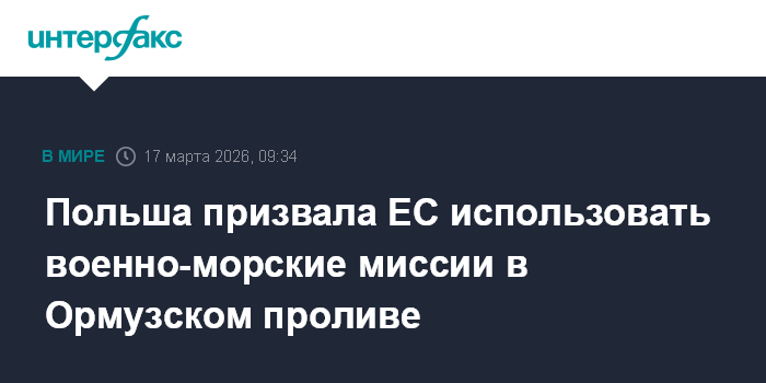 Москва. 17 марта. INTERFAX.RU - Евросоюзу стоит начать диалог с американской стороной о потенциальном использовании возможностей двух военно-морских миссий ЕС для разблокирования судоходства в Ормузском проливе, заявил министр иностранных дел Польши Радослав Сикорский. Об этом сообщают польские СМИ.
