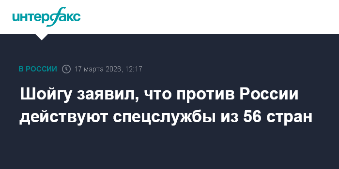 Москва. 17 марта. INTERFAX.RU - Против России действует система спецслужб из 56 стран, заявил секретарь Совета безопасности РФ Сергей Шойгу.