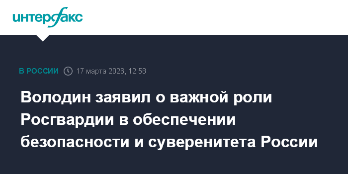 Москва. 17 марта. INTERFAX.RU - Председатель Госдумы Вячеслав Володин подчеркнул важную роль, которую играют спецслужбы и, в частности, войска национальной гвардии в обеспечении безопасности и суверенитета России.